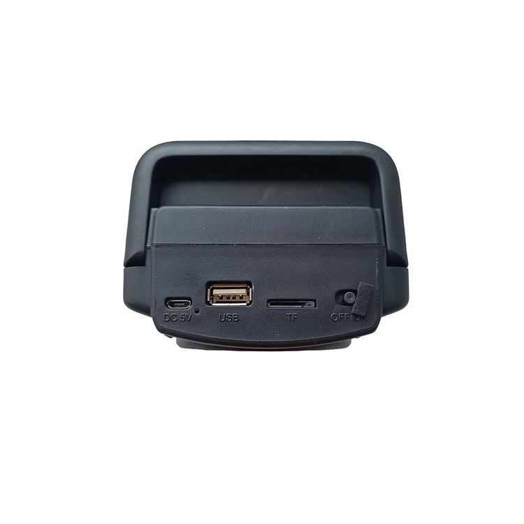 دسته این اسپیکر بلوتوث به نحوی طراحی شده است که به شما در حمل آن کمک کند، همچنین این دسته به یک جهت قابل تا شدن است. زیر دسته و روی سطح باند درگاه های ورودی دستگاه اعم از SD Card، USB، ورودی شارژر و دکمه روشن و خاموش کردن آن قرار دارد.