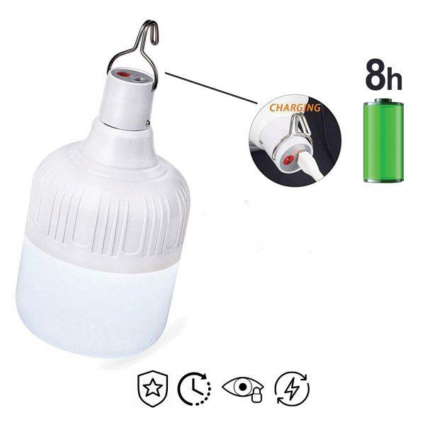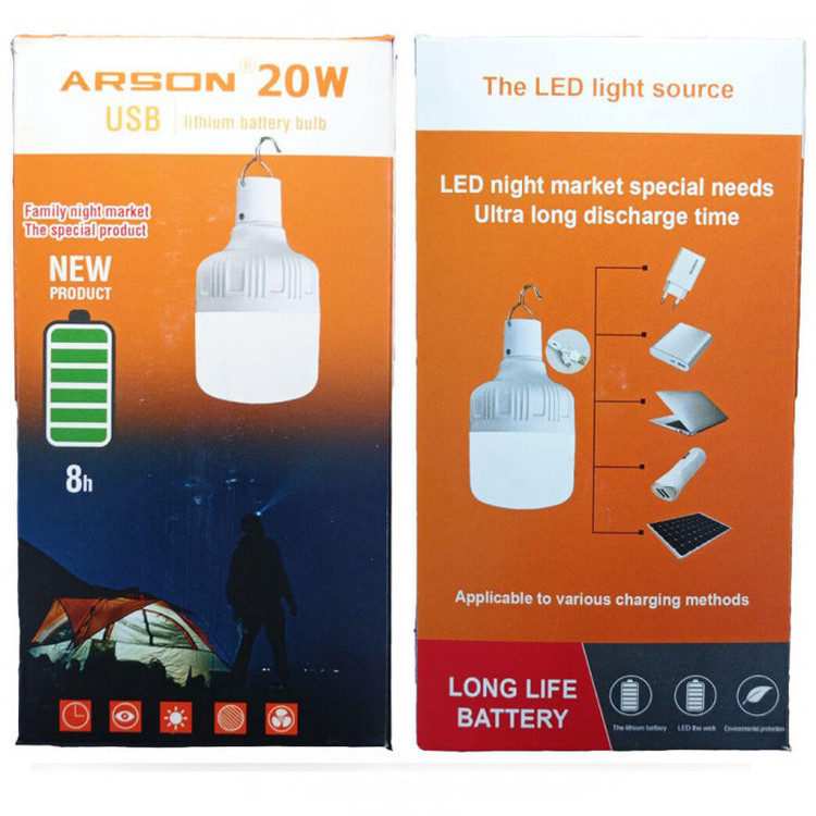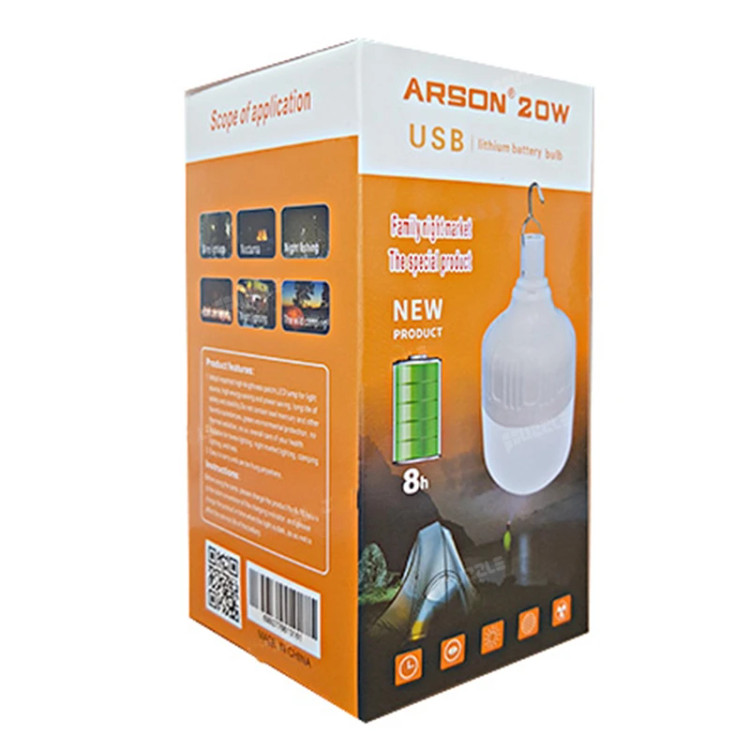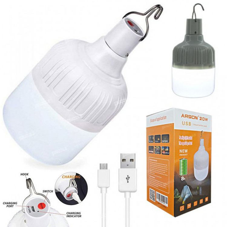 چراغ آویز ال ای دی شارژی آرسون مدل ۲۰W از محصولات خارق العاده و بسیار کاربردی و پرفروش آرسون بوده که دارای ۲۴ عدد چراغ LED کم مصرف بوده و قابلیت روشنایی طولانی مدت ۸ ساعت را دارا می باشد. این محصول شگفت انگیز ۵ حالت مختلف روشنایی دارد که شامل حالت ثابت، چشمک زن (در دو حالت پرنور و کم نور)، اضطراری (کمپینگ) و رقص نور بوده و با وجود توان بالای خروجی، کم مصرف می باشد. از ویژگی های بسیار مهم این لامپ شارژی، می توان به قابلیت حمل و نقل بسیار آسان آن به دلیل داشتن وزن کم و عمر بالای باتری آن اشاره کرد. در قسمت بالای این محصول، یک قلاب تعبیه شده است تا به آسانی به مکان دلخواهتان نصب شود. این محصول فوق العاده با روشن بودن مداوم اصلا گرم نمی شود و در زمان قطعی برق، بسیار کاربردی عمل می کند. در مواقع نیاز می توانید این چراغ را به راحتی از طریق پاوربانک و یا شارژر دیواری شارژ کرده و حتی آن را از طریق شارژر فندکی ماشین نیز شارژ کنید و در همه حال به آسانی از آن استفاده کنید. داشتن نور کافی و عمر بالای آن در مواقع ضروری که دسترسی به برق ندارید این وسیله را به ابزاری مفید و ضروری برای شما تبدیل می کند.